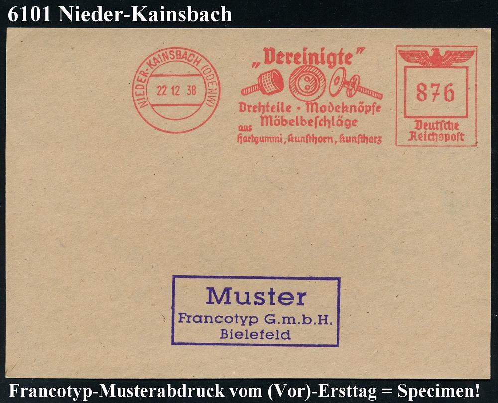 1243 | 35 € | POSTLEITRAUM 6100 (OHNE DARMSTADT) : NIEDER-KAINSBAH (ODENW)/ "Vereinigte"/ Drehteile - Modeknöpfe/ Möbelbeschläge/ aus/ Hartgummi,Kunsthorn u.Kunstharz 1938 (22.12.) AFS-Musterabdruck Francotyp "Reichsadler" (Knopf, Drehteile) glasklar gest. Francotyp-Musterblatt vom (Vor)-Ersttag!, selten! (Dü.E-5CGo) | ![]() ![]() | |