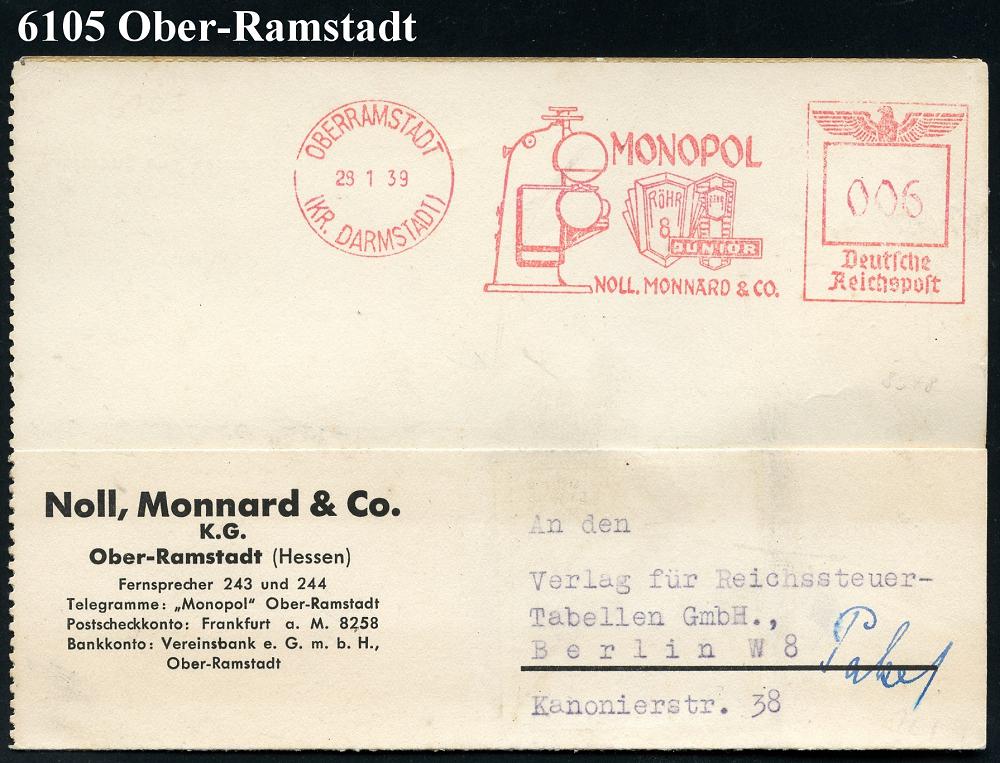 1244 | 25 € | POSTLEITRAUM 6100 (OHNE DARMSTADT) : OBERRAMSTADT/ KR.DARMSTADT)/ MONOPOL/ ..Noll,Monnard & CO. 1939 (28.1.) dekorativer AFS Francotyp "Reichsadler" (techn.Geräte u.Teile) klar gest. Firmen-Kt., ausgefallene Motive! (Dü.E-5CEo) | ![]() | |
