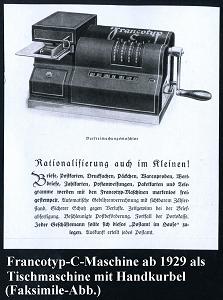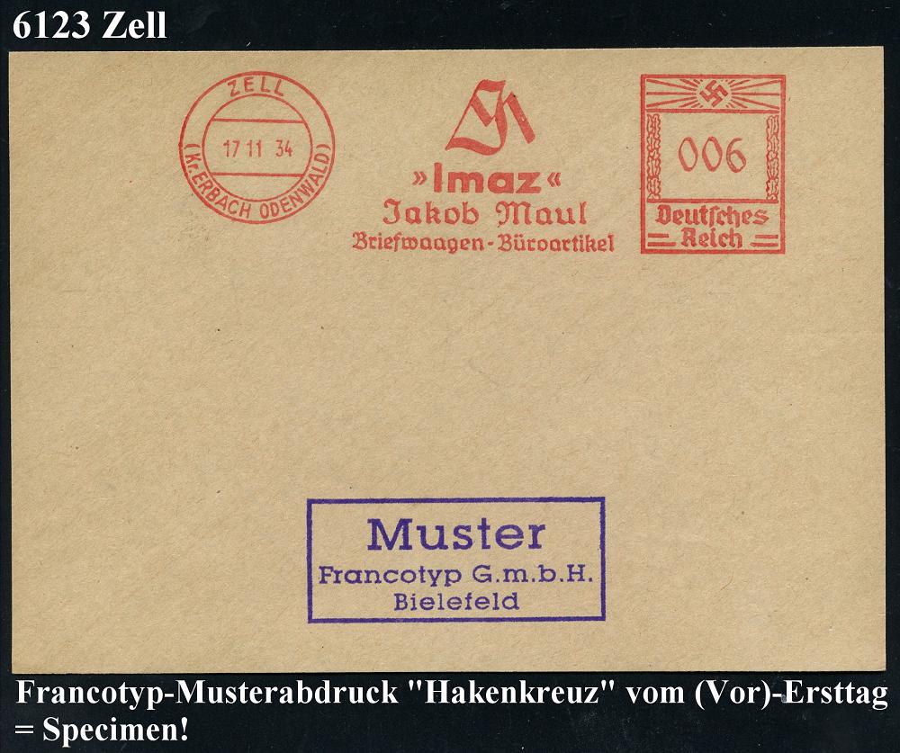 1247 | 35 € | POSTLEITRAUM 6100 (OHNE DARMSTADT) : ZELL/ (Kr.ERBACH ODENW)/ "Imaz"/ Jakob Maul/ Briefwaagen-Büroartikel 1934 (17.11.) AFS-Musterabdruck Francotyp "Hakenkreuz" (Firmen-Logo) glasklar gest. Francotyp-Musterblatt vom (Vor)-Ersttag!, selten!, vergl. Nr.1248! (Dü.E-3CEo) | ![]() ![]() | |