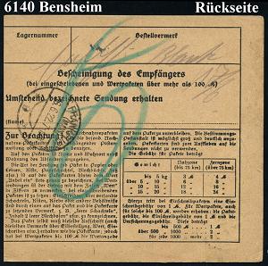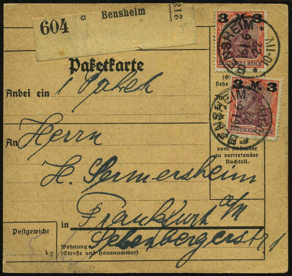 1178 | 18 € | POSTLEITRAUM 6100 (OHNE DARMSTADT) : BENSHEIM/ ** 1922 (16.6.) 1-BrückeK 2x auf Germania 3 Mk./1 1/4 Mk. + schw. Paketzettel: * Bensheim , klar gest. Inl.-Paket-Kt. n. Ffm, rs. AS (Mi.155 I, MeF) | ![]() ![]() | |