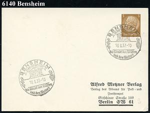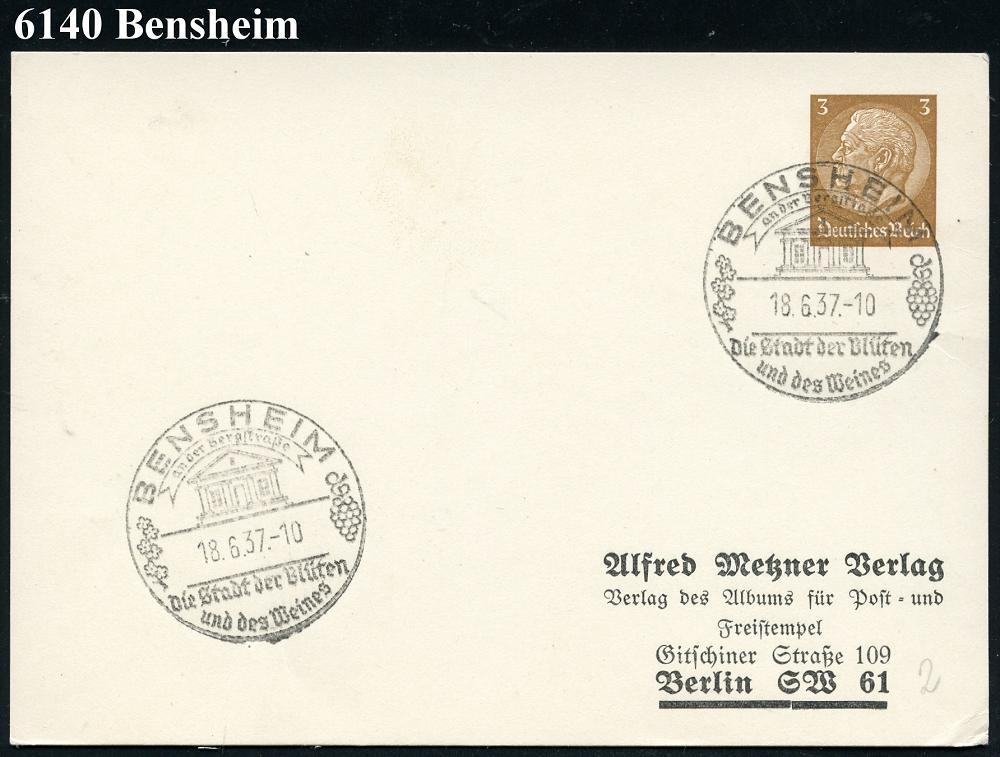 1179 | 18 € | POSTLEITRAUM 6100 (OHNE DARMSTADT) : BENSHEIM/ an d.Bergstraße/ Die Stadt d.Blüten/ und des Weines 1937 (18.6.) HWSt (Weintraube etc.) auf PPP 3 Pf. Hindenbg., braun (Metzner-Verlag, Mi.PP 122/B 9) klar gest. Inl.-Karte (Bo.2 , nur 1937-38 verwendet) | ![]() | |