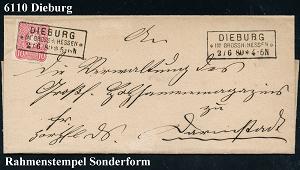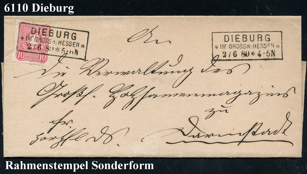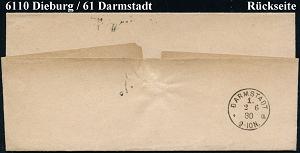 1186 | 18 € | POSTLEITRAUM 6100 (OHNE DARMSTADT) : DIEBURG/ *IM GROSSH:HESSEN*/ * 1880 (2.6.) Ra.3 = Stempel-Sonderform , 2x glasklar auf frankiertem Dienst-Bf. n. DDarmstadt, rs. AS. (Mi.33 EF) | ![]() ![]() | |