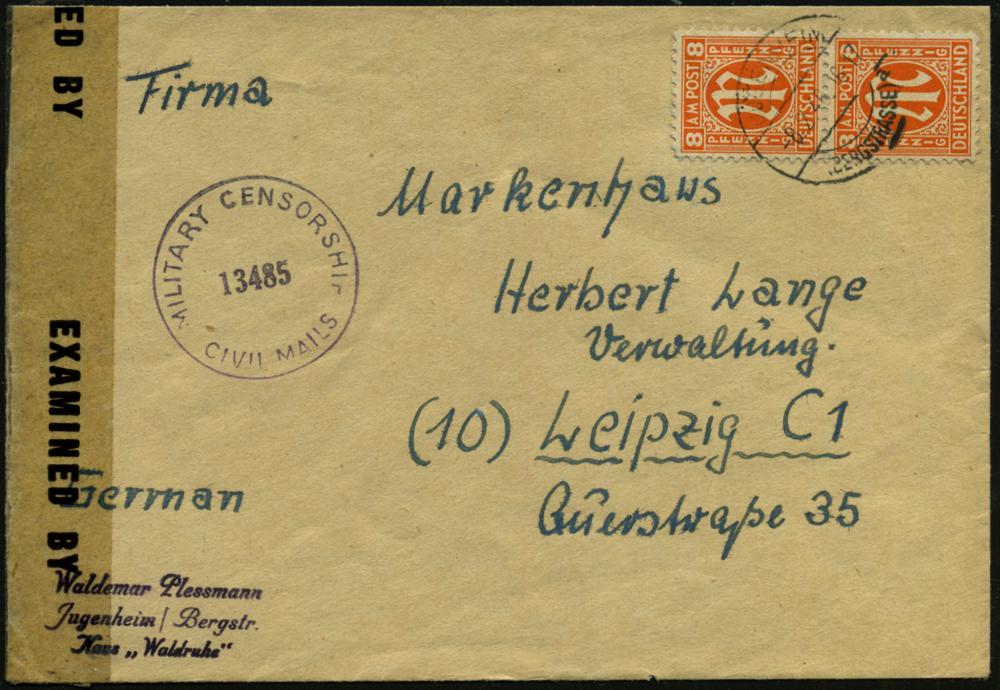 1216 | 15 € | POSTLEITRAUM 6100 (OHNE DARMSTADT) : JUGENHEIM/ (BERGSTRASSE)/ a 1946 (8.2.) 1K-Brücke auf Paar 8 Pf. AM-Post + US-Zensur-1K: MILITARY CENSORSHIP/ 13485.. + Klebe-Streifen: EXAMINDED BY (= Offenbach), Inl.-Zensur-Bf. n. Leipzig (Mi.5 MeF) | ![]() | |