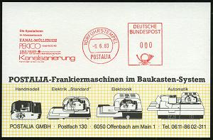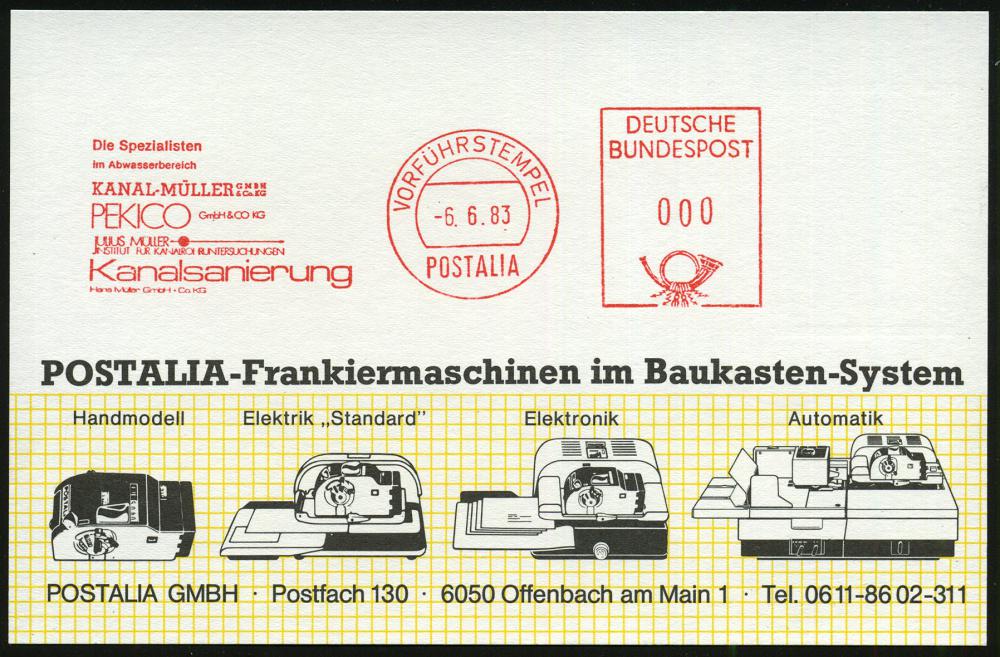 1190 | 18 € | POSTLEITRAUM 6100 (OHNE DARMSTADT) : Eppertshausen 1983 (6.6.) AFS.: VORFÜHRSTEMPEL/POSTALIA/Die Spezialisten/im Abwasserbereich/KANAL-MÜLLER../ Kanalsanierung , seltene Postalia-Musterkt.! (= Specimen) | ![]() | |