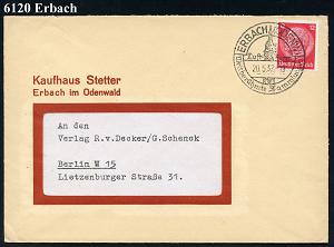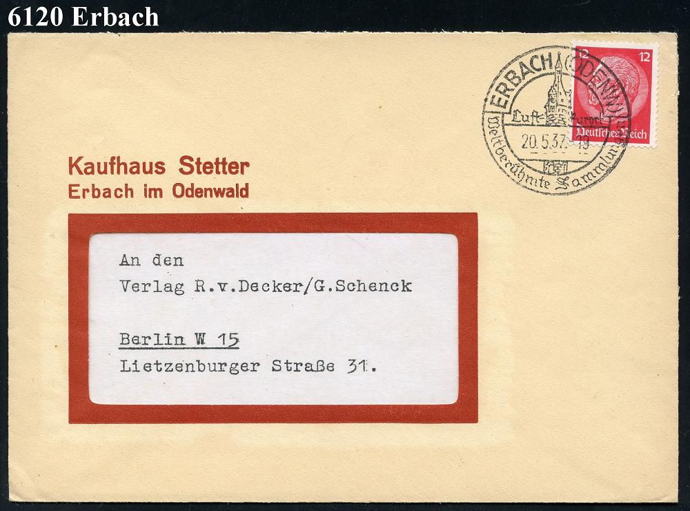 1191 | 16 € | POSTLEITRAUM 6100 (OHNE DARMSTADT) : ERBACH (ODENW)/ Weltberühmte Sammlungen 1937 (20.5.) HWSt (Turm des Erbacher Schlosses) = Elfenbein-Sammlung u.a., Firmen-Bf.: Kaufhaus Stetter.. (Bo.2) | ![]() | |