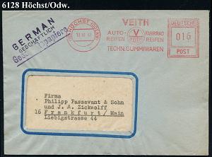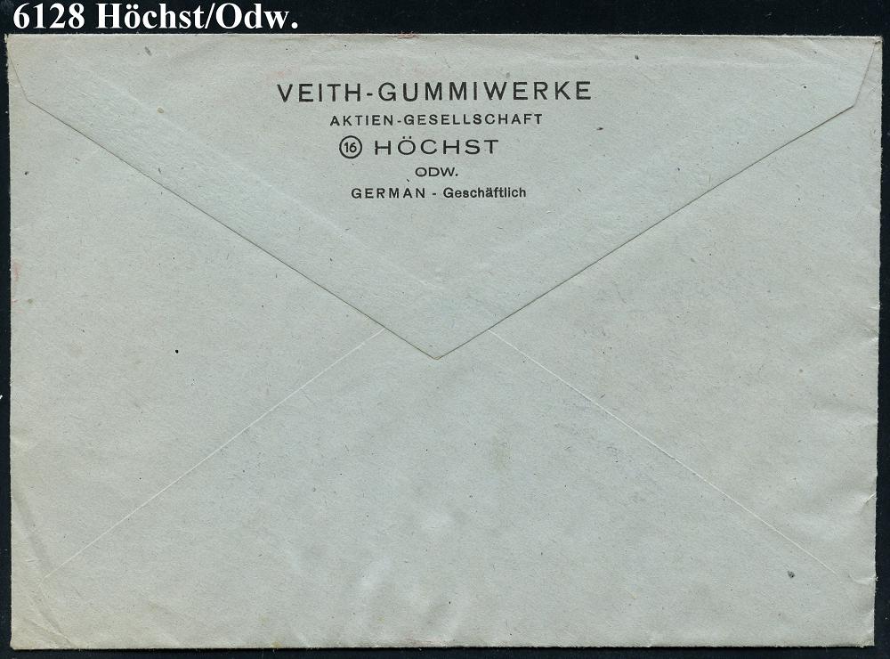 1215 | 18 € | POSTLEITRAUM 6100 (OHNE DARMSTADT) : (16) HÖCHST (ODENW)/ VEITH/ AUTO-/ REIFEN/ FAHRRAD/ REIFEN/ TECHN.GUMMIWAREN 1947 (10.10.) seltener AFS-Francotyp "Hochrechteck" , rs. Abs.-Vordruck, klar gest. Firmen-Bf. (Dü.E-18CG , nur 1946-47 verwendet!) | ![]() ![]() | |