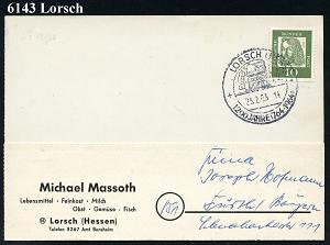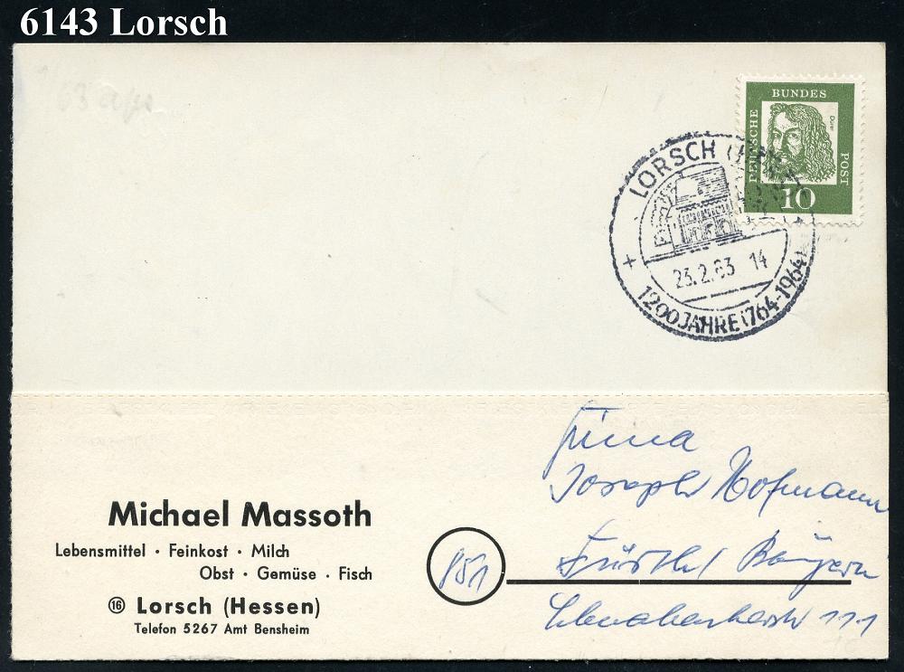 1221 | 12 € | POSTLEITRAUM 6100 (OHNE DARMSTADT) : LORSCH (HESS)/ 1200 JAHRE (764-1964) 1963 (23.2.) seltener, aptierter HWSt = alte PLZ entfernt! (= karoling. Königshalle des Klosters) klar gest. Firmen-Kt.: Michael Massoth.. (Bo.1 aptiert) | ![]() | |