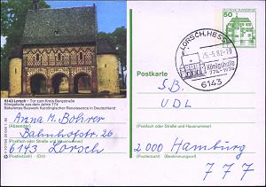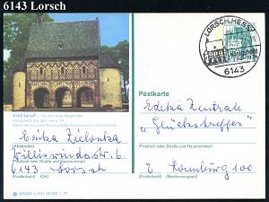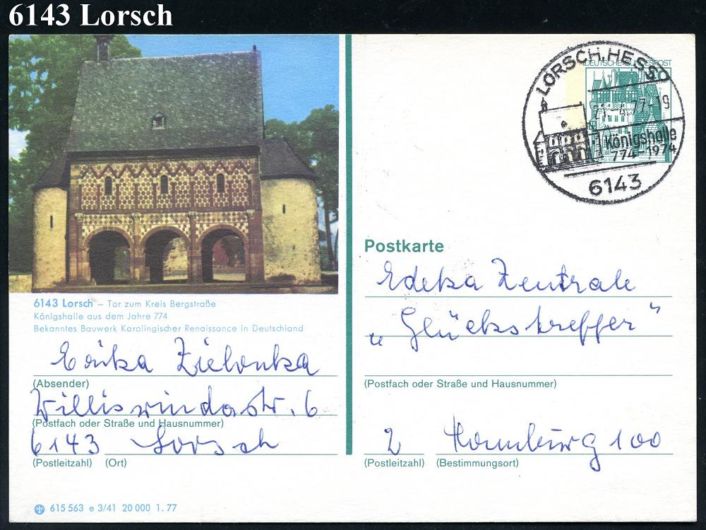 1224 | 15 € | POSTLEITRAUM 6100 (OHNE DARMSTADT) : 6143 LORSCH,HESS/ Königshalle/ 774.. 1982 (15.5.) HWSt auf motivgl. BiP 50 Pf. Burgen, grün: 6143 Lorsch.. Königshalle = karoling. Königshalle des Klosters (Mi.P 130) Bedarf!, seltene Kombination! (Bo.5) | ![]() | |