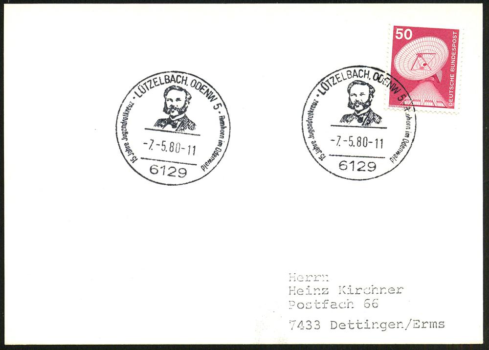 1227 | 12 € | POSTLEITRAUM 6100 (OHNE DARMSTADT) : 6129 LÜTZELBACH,ODENW 5/ 15 Jahre Jugendrotkreuz.. 1980 (7.5.) seltener HWSt = Henri Dunant (Brustbild) Inl.-Karte (Friedensnobelpreis 1901) | ![]() | |