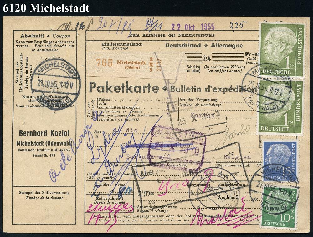 1231 | 18 € | POSTLEITRAUM 6100 (OHNE DARMSTADT) : MICHELSTADT/ (ODENWALD) 1955 (21.10.) 1K-Brücke 3x auf Heuss I 10 Pf., 15 Pf. u. Paar 1 DM, satzreine Frankatur (= 225 Pf.) + brauner Paketzettel: Michelstadt/(Odenw) + TS Aachen, Ausl.-Paketkt- n. Belgien (Mi.183/84, 2x 194) | ![]() | |