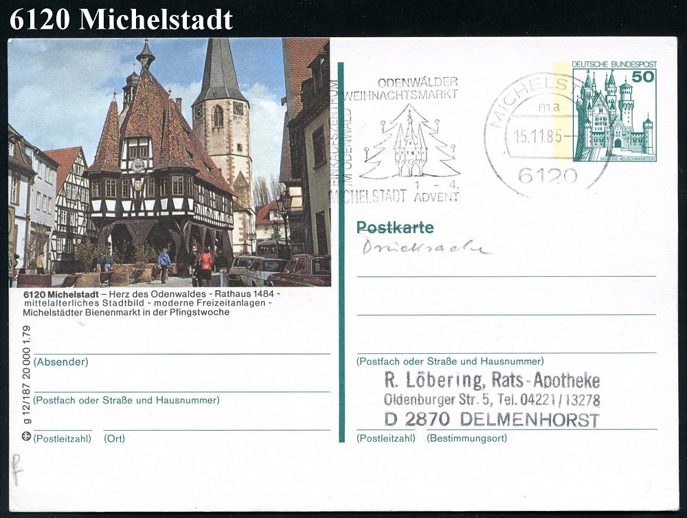 1241 | 12 € | POSTLEITRAUM 6100 (OHNE DARMSTADT) : 6120 MICHELSTADT/ ma/ ODENWÄLDER/ WEIHNACHTSMARKT/ ..1.-4./ ADVENT 1985 (15.11.) MWSt (Rathaus vor Tanne) auf orts- u. motivgl. BiP 50 Pf. Burgen, blaugrün: 6120 Michelstadt.. Rathaus.. (Mi.P 129) Fern-Kt., seltene Kombination! | ![]() | |