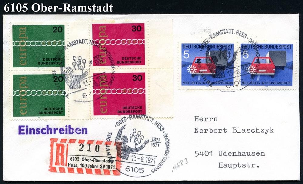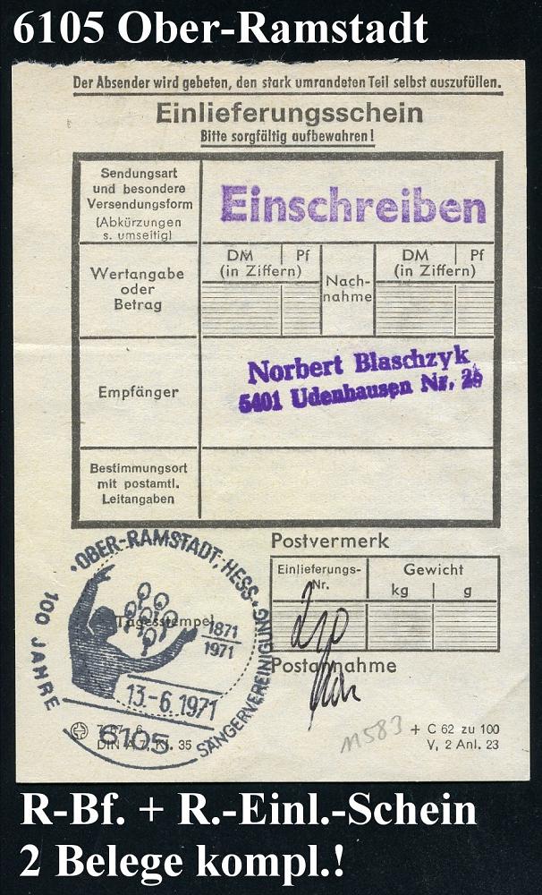 1245 | 30 € | POSTLEITRAUM 6100 (OHNE DARMSTADT) : 6105 OBER-RAMSTADT,HESS/ 100 JAHRE SÄNGERVEREINIGUNG 1971 (13.6.) SSt (Dirigent vor Chor) 3x + Sonder-RZ: 6105 Ober-Ramstadt/Hess, 100 Jahre SV 1871 (NEZ-Kat. Nr.161) + R-Einl.-Schein, Inl.-R-Bf., 2 Belege kompl., Aufl. nur 259 R-Belege! (Bo.1) | ![]() ![]() | |