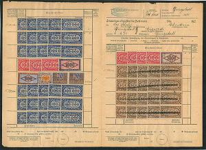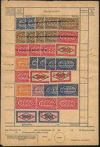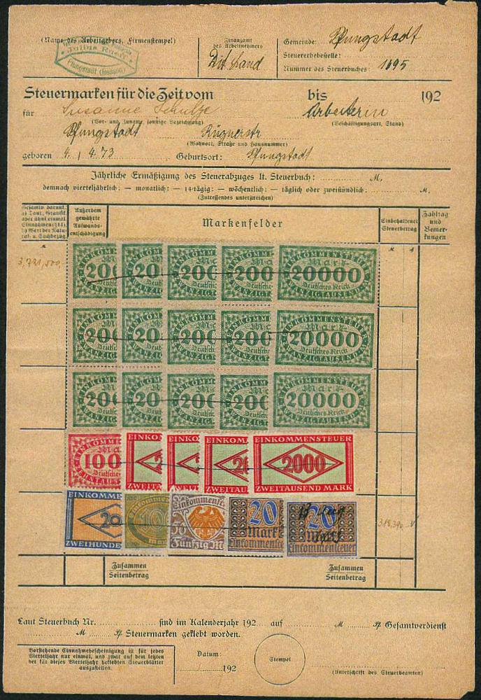 1246 | 35 € | POSTLEITRAUM 6100 (OHNE DARMSTADT) : Pfungstadt 1923 Infla-Eikommensteuermarken 20 Mk bis 1 Mio. in Faltblatt auf Einkommensteuererkläung (Format A4) 118 Stück, treppenartig geklebt, Dokument der Hochinflation! | ![]() ![]() ![]() | |