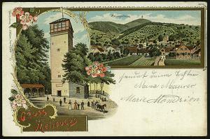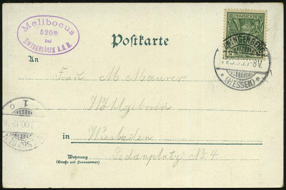 1250 | 20 € | POSTLEITRAUM 6100 (OHNE DARMSTADT) : ZWINGENBERG/ *(HESSEN)* 1900 (11.8.) 1K-Gitter aif EF 5 Pf. Germania "Reichspost", gün + ovaler HdN: Melibocus/520m.. , dekorarive Color-Litho-Goldrand-Ak: Gruss vom Melibocus (Aussichtsturm) Bedarf (Mi.55 EF) | ![]() ![]() | |