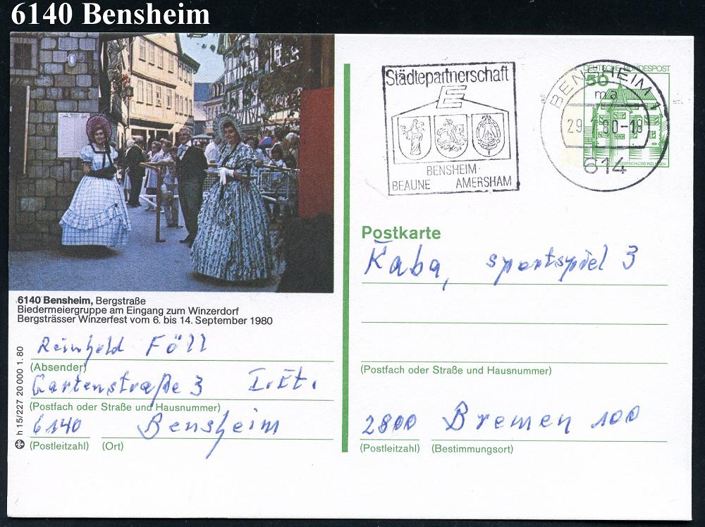1185 | 14 € | POSTLEITRAUM 6100 (OHNE DARMSTADT) : 6140 BENSHEIM 1/ ma/ Städtepartnerschaft/ BENSHEIM/ BEAUNE AMERSHAM 1980 (29.1.) MWSt auf ortsgleicher 50 Pf. BiP Burgen, grün: 6140 Bensheim.. Biedermeiergruppe am.. Winzerdorf,.. Winzerfest 1980 (Frauen in Biedermeiermode) Bedarf!, seltene Kombination! (Mi.P 130-h 15/227) | ![]() | |
