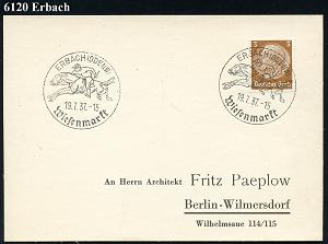 1192 | 12 € | POSTLEITRAUM 6100 (OHNE DARMSTADT) : ERBACH (ODENW)/ Wiesenmarkt 1937 (19.7.) SSt = Galopper (mit Mütze u. Reitpeitsche) klar gest. Inl.-Karte (Bo.3 , Erstjahr!, 2. Renntag) | ![]() | |