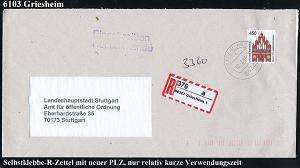 1203 | 14 € | POSTLEITRAUM 6100 (OHNE DARMSTADT) : 64347 GRIESHEIM,HESS 1/ c 1995 (10.2.) 1K-Segment auf EF 450 Pf. Bauwerke + Selbstklebe-R-Zettel: 64347 Griesheim 1/a = letzter deutscher R-Zettel mit Ortsangabe! , klar gest. Fern-R-Bf. (Mi.1623 EF + 10.- EUR) | ![]() | |