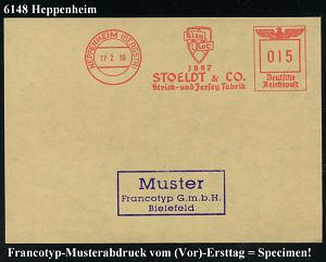 1209 | 35 € | POSTLEITRAUM 6100 (OHNE DARMSTADT) : HEPPENHEIM (BERGSTR)/ Blau/ Rot/ 1897/ STOELDT & CO./ Strick-u.Jersey-Fabrik 1939 (17.2.) AFS-Musterabdruck Francotyp "Reichsadler" (Firmen-Logo) glasklar gest. Francotyp-Musterblatt vom (Vor)-Ersttag!, selten! (Dü.E-5CGo) | ![]() ![]() | |