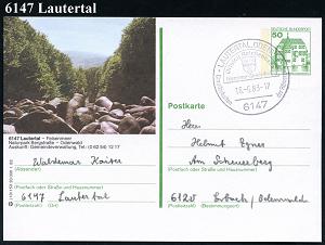 1219 | 14 € | POSTLEITRAUM 6100 (OHNE DARMSTADT) : 6147 LAUTERTAL,ODENW 1/ Felsenmeer../ Granitarbeiten der Römerzeit 1983 (16.6.) HWSt auf orts- und motivgleicher BiP 50 Pf. Burgen, grün: 6147 Lautertal Felsenmeer.. (Mi.P 134/j 10/153) Fern-Kt., seltene Kombination! | ![]() | |