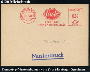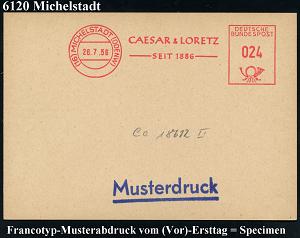 1232 | 25 € | POSTLEITRAUM 6100 (OHNE DARMSTADT) : (16) MICHELSTADT (ODENW)/ CAESAR & LORENTZ/ SEIT 1886 1958 (26.7.) AFS-Musterabdruck Francotyp "Posthorn" glasklar auf Francotyp-Musterkarte mit hs. Maschinen-Nr. "Cc 18612 II", seltenes Unikat!, vergl. Nr. 1233 (Dü.E-23CO) | ![]() ![]() | |