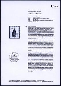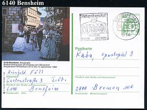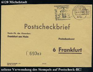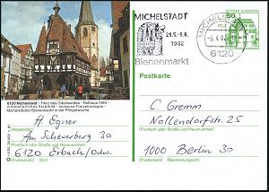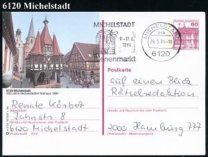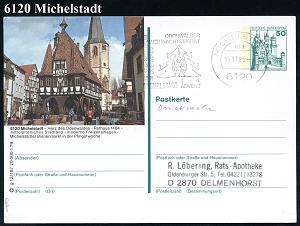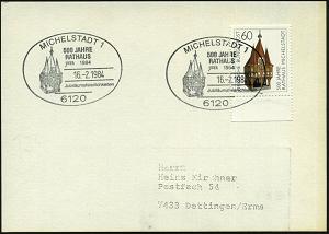 1239 | 16 € | POSTLEITRAUM 6100 (OHNE DARMSTADT) : 6120 MICHELSTADT 1/ ma/ 9.-17.84./ ..Bienenmarkt 1984 (28.3.) MWSt (Bienenkorb, Biene, Rathaus) ortsgl. BiP 60 Pf. Burgen, lilarotgrün: 6120 Michelstadt.. 500 Jahre Michelstädter Rathaus (Mi.P 138) Bedarf, seltene Kombination! (Bo.36 A) | ![]() | |