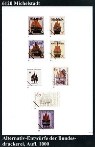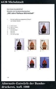 1236 | 18 € | POSTLEITRAUM 6100 (OHNE DARMSTADT) : Michelstadt 1983 (Nov.) 60 Pf. "500 Jahre Rathaus Michelstadt", 0rig Entwurf + 13 Alternativ-Entwürf der Bundesdruckerei auf 2 amtl. Entwurfsblättern (Format A5), Aufl. nur 1000 (zu Mi.1200) | ![]() ![]() | |