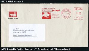1242 | 8 € | POSTLEITRAUM 6100 (OHNE DARMSTADT) : 6120 MICHELSTADT 1/ F75 6557/ Fernweh ist heilbar/ Reise-u.Flugbüro kugel.. 1996 (12.1.) AFS Postalia Thermodruck m.Kennung (Palmenparadies) Firmen-Bf..: TUI | ![]() ![]() | |