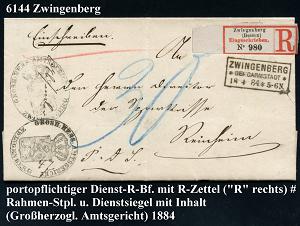 1249 | 28 € | POSTLEITRAUM 6100 (OHNE DARMSTADT) : ZWINGENBERG/ *BEI DARMSTADT* 1884 (18.4.) Ra.3 + ungez. RZ: Zwingenberg/(Hessen) = Randstück "R" rechts + Dienst-siegel-HdN: GROSSH. HESS.AMTSGERICHT (Wappen) Dienstbf. (Mittelfalte) m. Inhalt, hs."30" (Pf.), Nachgebühr-R-Bf. n.Reinheim | ![]() | |