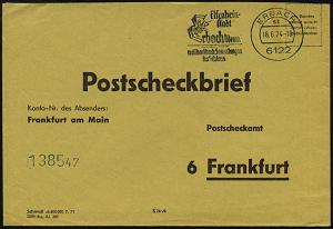 1197 | 15 € | POSTLEITRAUM 6100 (OHNE DARMSTADT) : 6122 ERBACH/ sb/ Elfenbein-/ stadt/ ..weltberühmte Sammlungen.. 1974 (18.6.) MWSt = Reiterfigur aus der Elfenbein-Sammlung , portofreier, gelber PSch-Bf. (kl. Rißchen) = seltene Verwendung! (Bo.7 A II) | ![]() | |