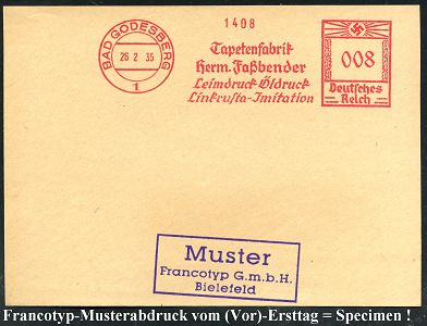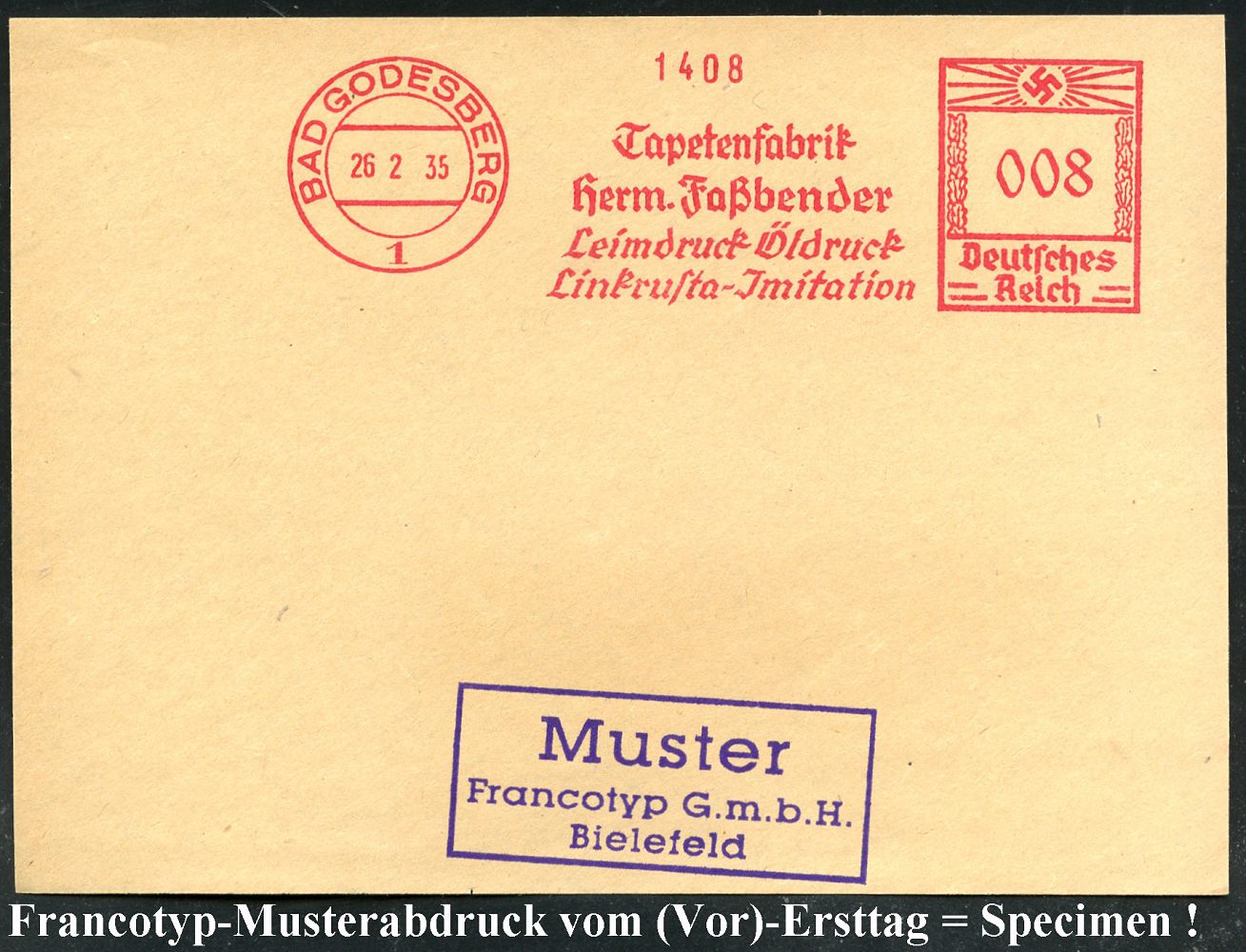 9987 | 35 € | 5320 BAD GODESBERG : BAD GODESBERG/ 1/ Tapetenfabrik/ Her,.Faßbender/ Leindruck-Öldruck/ Linkrusta-Jmitation 1935 (26.2.) AFS-Musterabdruck Francotyp "Hakenkreuz" , glasklar gest. Francotyp-Musterblatt vom (Vor)-Ersttag !, selten!, vergl. Kat.-Nr. 9988 (Dü.E-3CEh) | ![]() ![]() | |