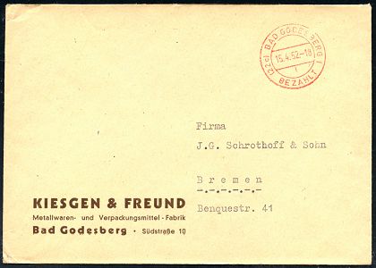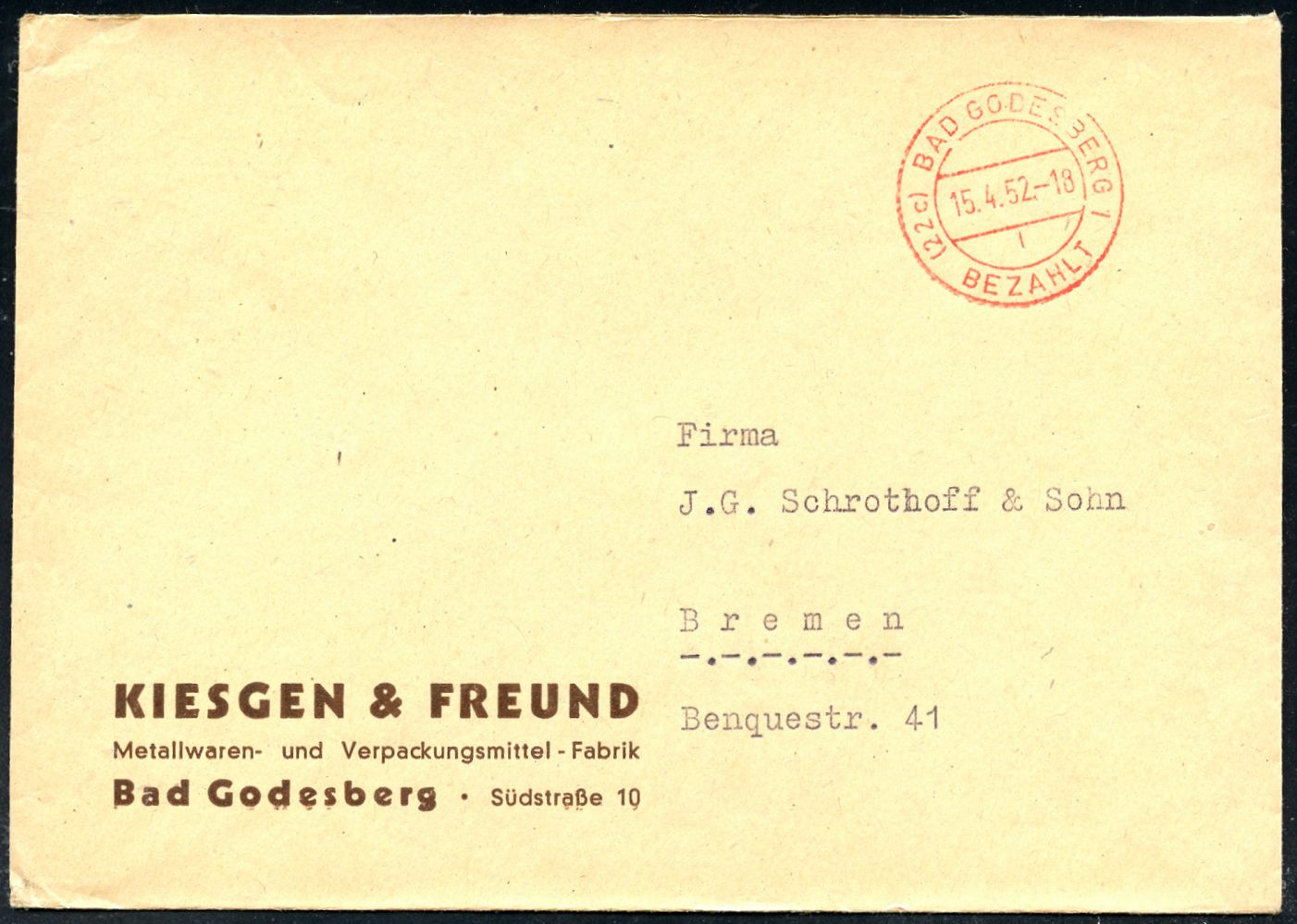 9998 | 10 € | 5320 BAD GODESBERG : (22c) BAD GODESBERG 1/ l/ BEZAHLT 1952 (15.4.) 2K-Steg PFS mit Uhrzeit azf Firmen-Bf.: KIESGEN & FREUND, Metallwaren.. (Dü.A-7, Nr.32) | ![]() | |