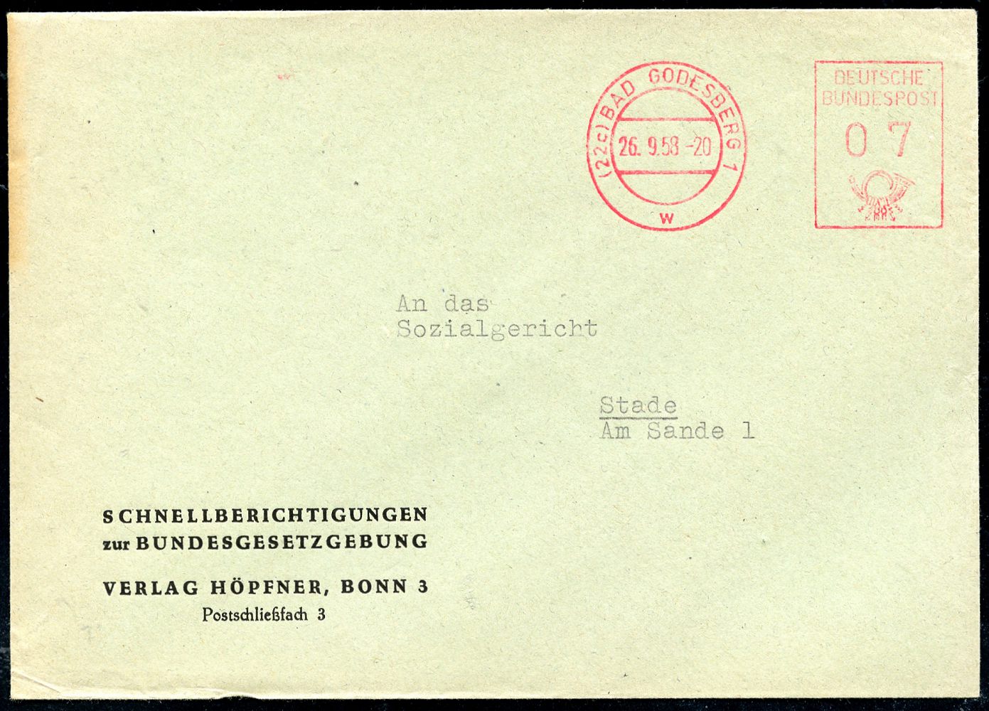 10005 | 8 € | 5320 BAD GODESBERG : (22c) BAD GODESBERG 1/ w/ DEUTSCHE/ BUNDESPOST 1958 (26.9.) PFS Hochrrechteck "Posthorn" mit Uhrzeit, UB "w" , Firmen-Bf.: SCHNELLBERICHTIGUNGEN zur BUNDESGESETZGEBUNG, VERLAG HÖPFNER.. (Dü.D-17) | ![]() | |