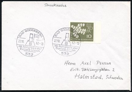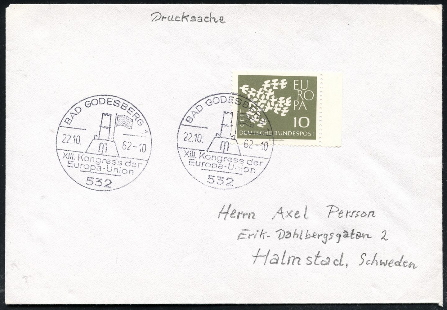 10010 | 14 € | 5320 BAD GODESBERG : 532 BAD GODESBERG/ Kongress der/ Europa-Union 1962 (22.10.) SSt (Godesburg) auf EF 10 Pf. Europa CEPT, Ausl.-Drs.-Bf. (Bo.14) | ![]() | |