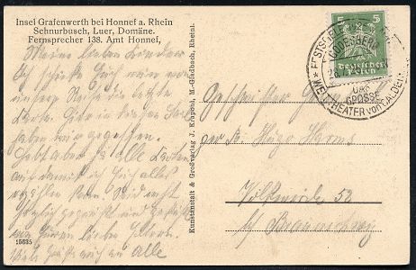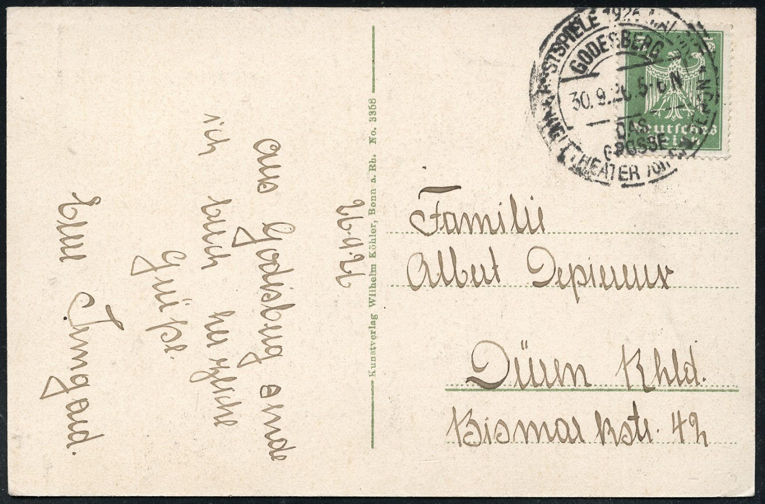 9981 | 25 € | 5320 BAD GODESBERG : Bad Godesberg 1926 (28.7.) HWSt.: GODESBERG/DAS/ GROSSE/ WELTTHEATER VON CALDERON/FESTSPIELE 1926 MAI-OKT. = span. katholischer Autor Caldereon de la Barca (1600-81) klar gest., monochrome Foto-Ak.: Bad Godesberg, Rheininsel Grafenwerth, Lindenwirtin (Restaurant-Säle) Bedarf (Bo.3 , nur 1926 verwendet) | ![]() ![]() | |
