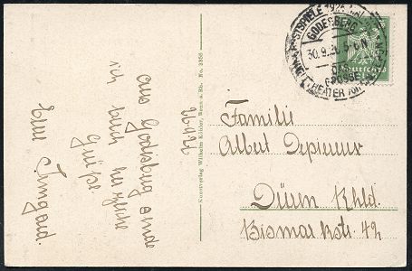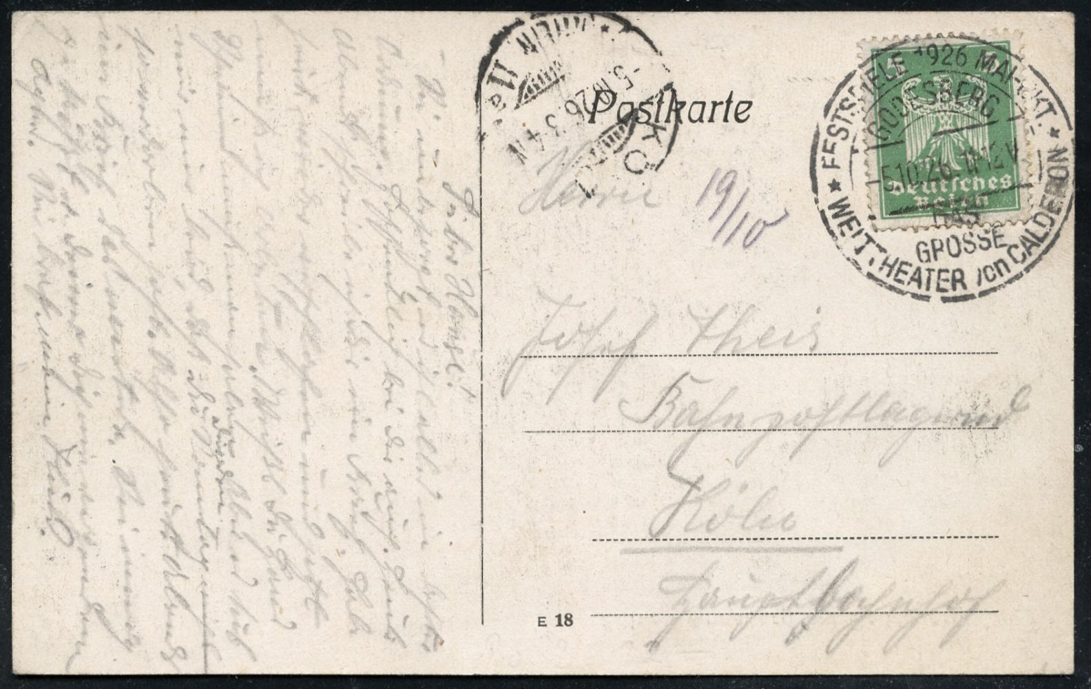 9983 | 20 € | 5320 BAD GODESBERG : Bad Godesberg 1926 (5.10.) HWSt.: GODESBERG/DAS/ GROSSE/ WELTTHEATER VON CALDERON/FESTSPIELE 1926 MAI-OKT. = span. katholischer Autor Caldereon de la Barca (1600-81) klar gest. Color-Ak.: Bad Godesberg, Schloß Annaberg, Bedarf (Bo.3 , nur 1926 verwendet) | ![]() ![]() | |