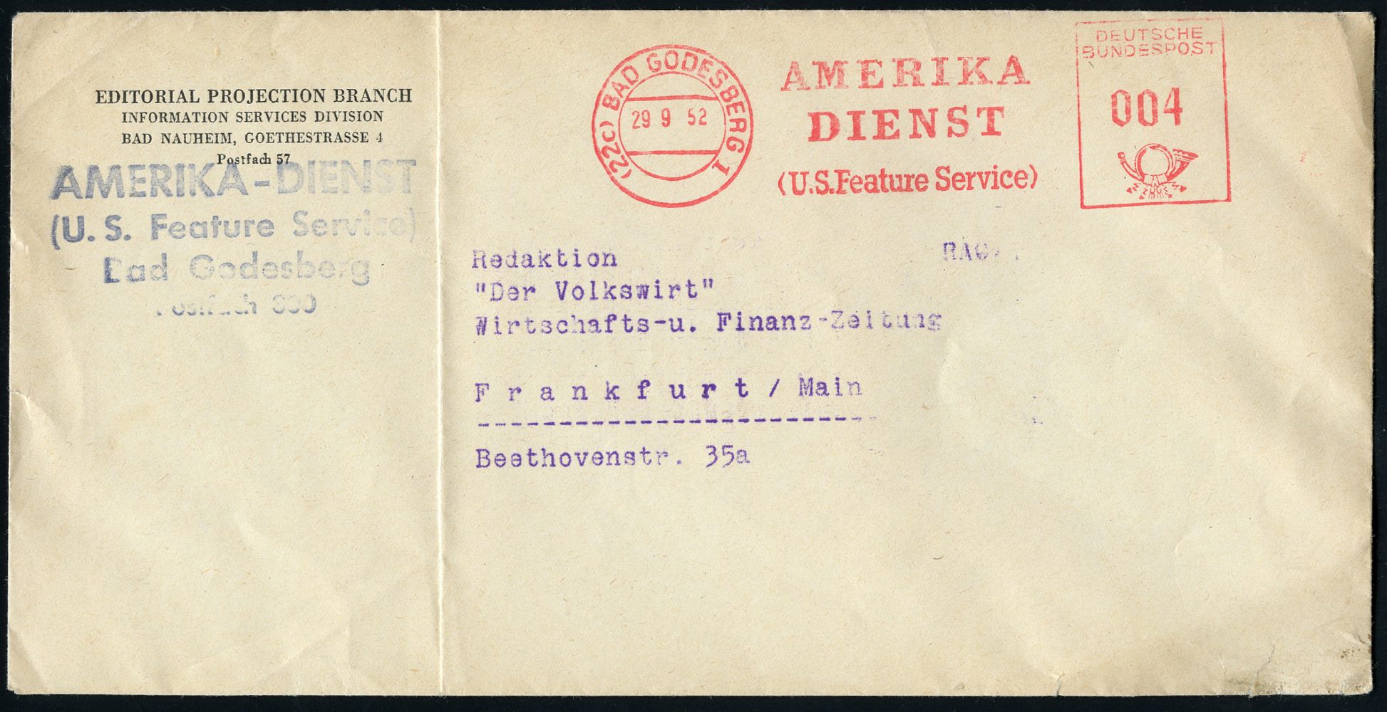 9999 | 18 € | 5320 BAD GODESBERG : (22c) BAD GODESBERG 1/ AMERIKA/ DIENST/ (US.Feature Service) 1952 (29.9.) AFS Francotypp + Abs.-3L: AMERIKA-DIENST/ (U.S. Feature Service).... (Bf links gefaltet) alliierter Dienst-Bf.: EDITORIAL PROJECTION BRANCH, INFORMATION SERVICE DIVISION, BAD NAUHEIM.. (Dü.E-23CG) | ![]() | |