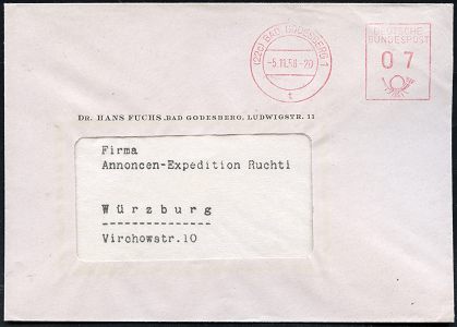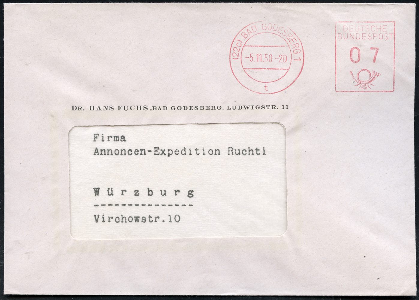 10004 | 6 € | 5320 BAD GODESBERG : (22c) BAD GODESBERG 1/ t/ DEUTSCHE/ BUNDESPOST 1958 (5.11.) PFS Hochrechteck "Posthorn" mit Uhrzeit, UB "t" auf Firmen-Bf.: DR. HANS FUCHS.. (Dü.D-17) | ![]() | |