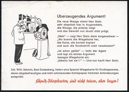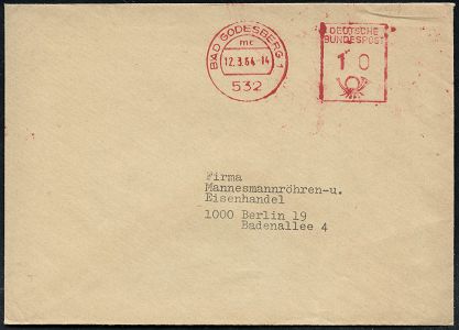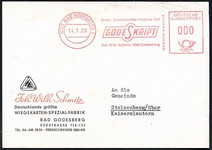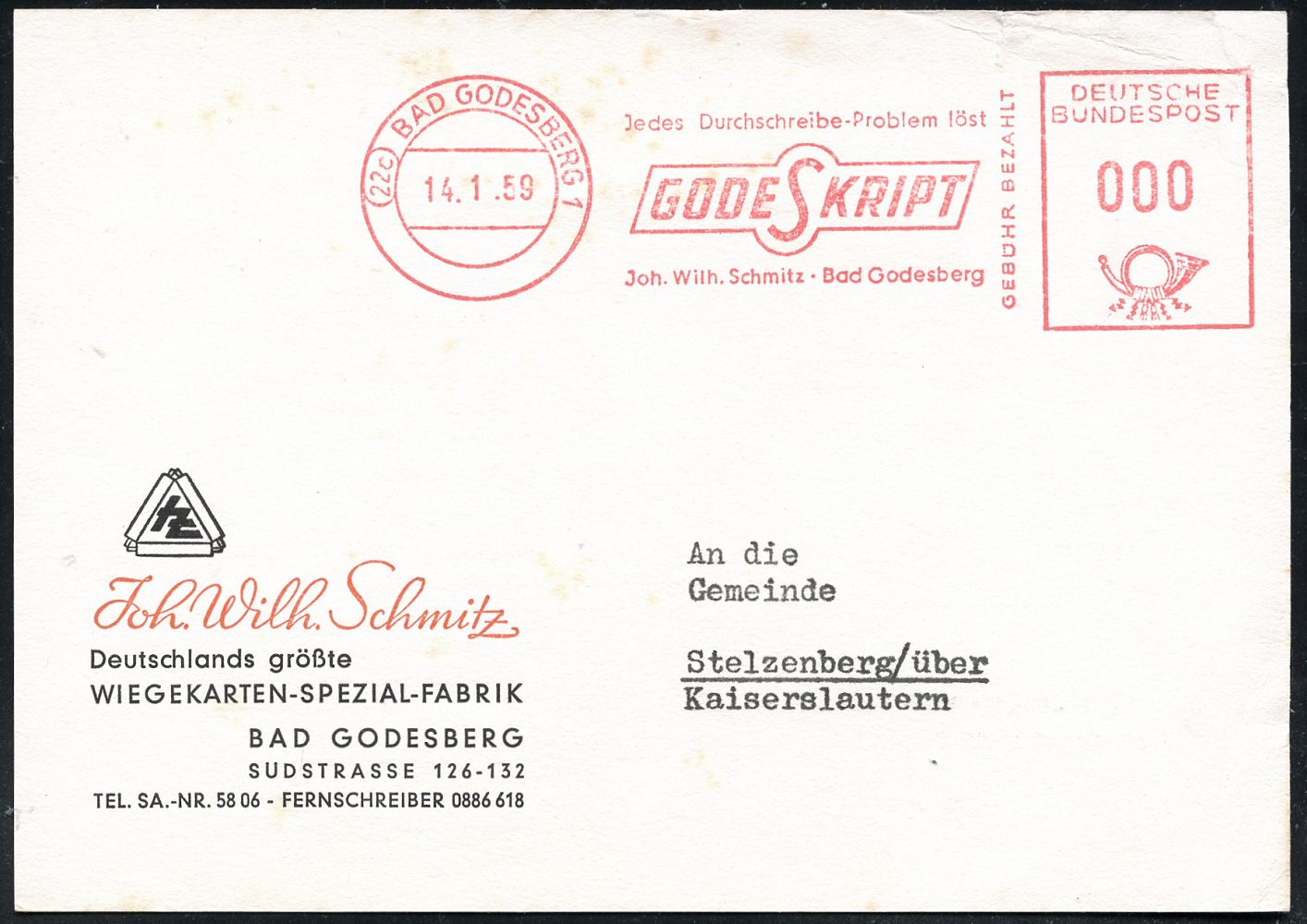 10006 | 10 € | 5320 BAD GODESBERG : (22c) BAD GODESBERG 1/ ..GODESKRIPT/ Joh.Wilh.Schmitz.. 1959 (14.1.) AFS Francotyp in 000 + GEBÜHR BEZAHLT = Massen-Drs. (vorschriftsmäßig vom 1.7.1954 - 30.9.1969) zweifarbige Reklame-Kt. für Wiegekarten (oben schwach fleckig) rs. Grafik (Dü.E-23CO) | ![]() ![]() | |