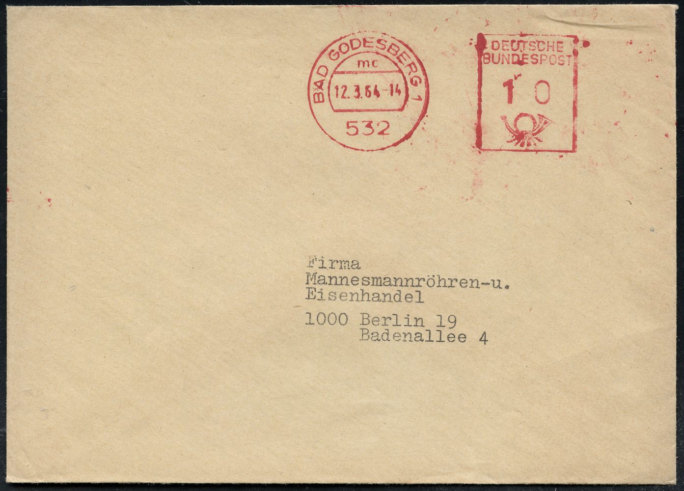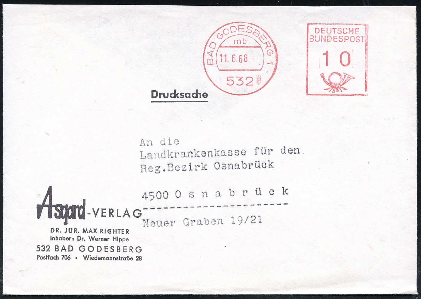 10015 | 6 € | 5320 BAD GODESBERG : 532 BAD GODESBERG 1/ mb/ DEUTSCHE/ BUNDESPOST 1968 (11.6.) PFS Hochrechteck "Posthorn" ohne Uhrzeit, UB "mb" , Firmen-Bf.: Asgard-Verlag, Dr. jur. Max Richter.. (rs. fehlt Klappe) (Dü.D-17) | ![]() | |