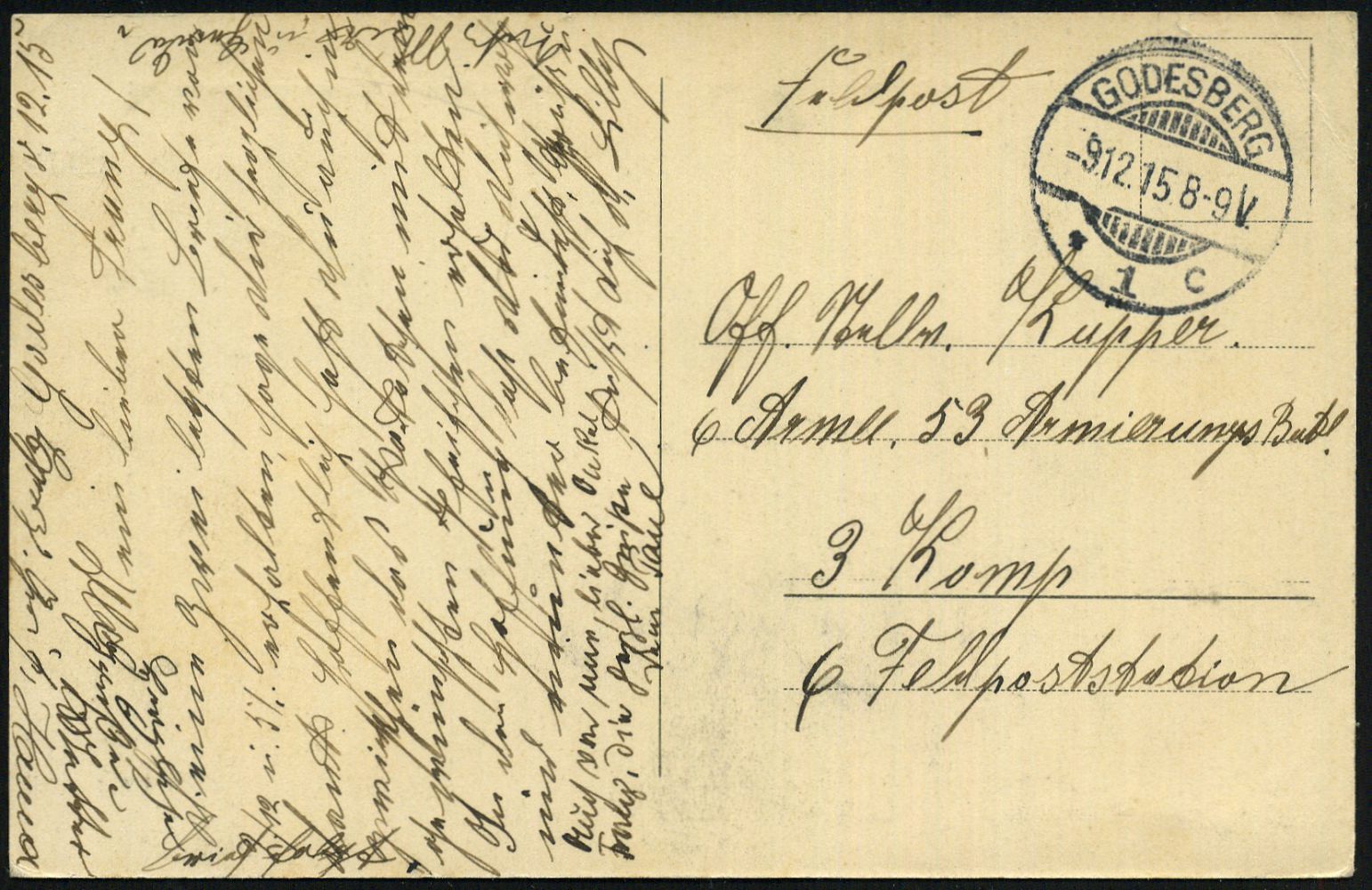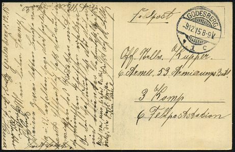 9980 | 15 € | 5320 BAD GODESBERG : Bad Godesberg 1915 (9.12.) 1K-Gitter: GODESBERG/* 1 c klar auf s/w.-Feldpost-Foto-Ak.: Rolandseck an 53. Armierungs-Batl., 6 Armee, Feldpoststation 6 | ![]() ![]() | |