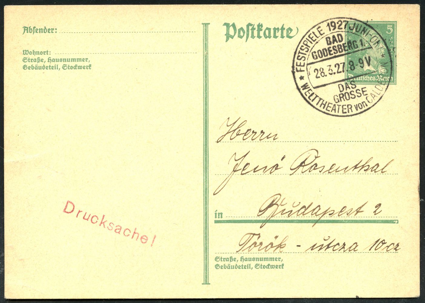 9984 | 20 € | 5320 BAD GODESBERG : BAD GODESBERG 1/ DAS/ GROSSE/ WELTTHEATER VON CALDERON/ FESTSPIELE 1927.. 1927 (28.3.) HWSt (= span.-kathol. Autor Calderon de la Barca, 1600-81) klar gest. Ausl.-Karte n. Budapest (Bo.4) | ![]() | |