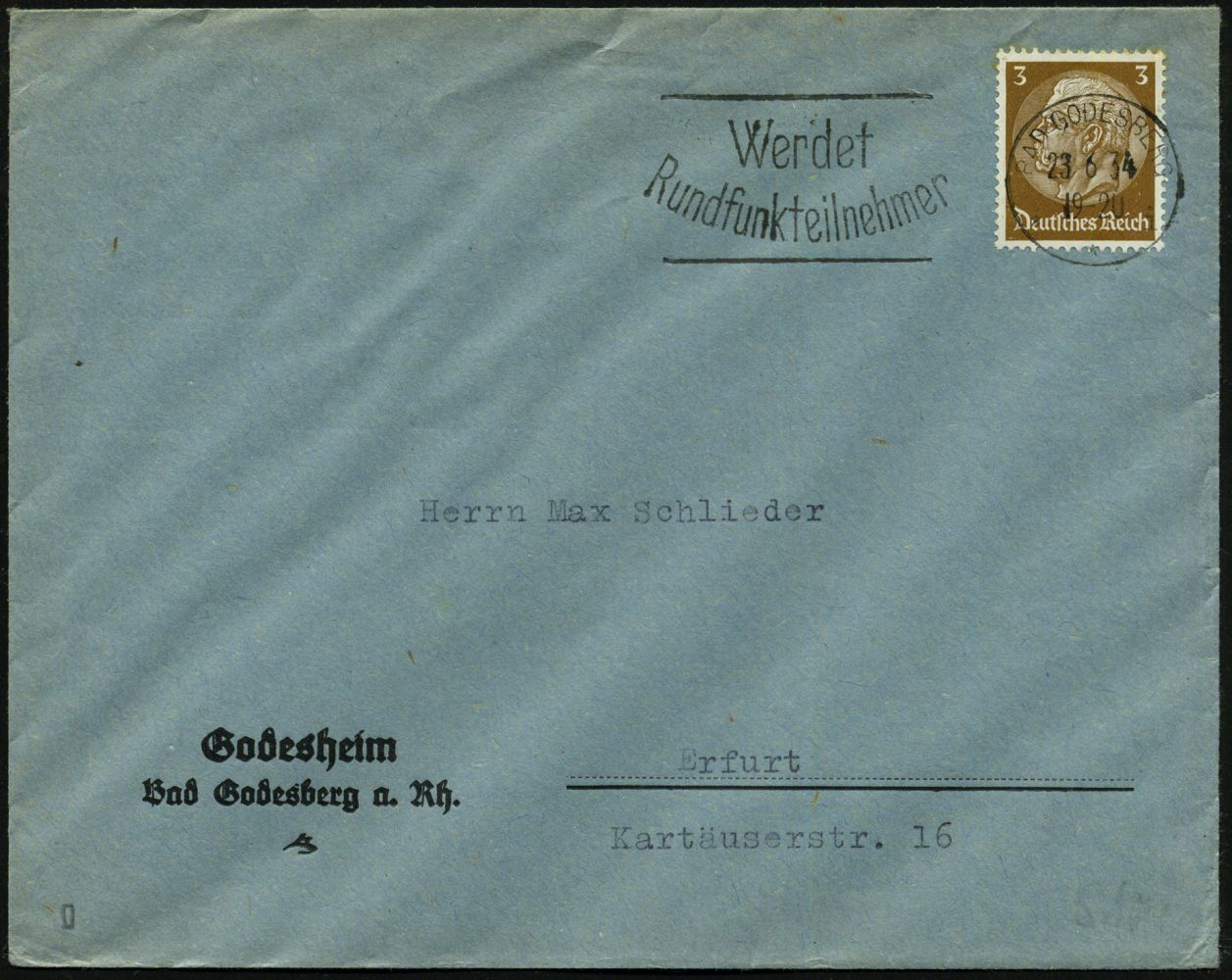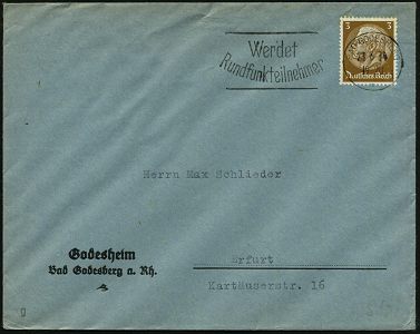 9986 | 18 € | 5320 BAD GODESBERG : BAD GODESBERG/ **i/ Werdet/ Rundfunkteilnehmer 1934 (23.6.) Serien-MWSt auf Vordruck-Bf.: Godesheim, Bad Godesberg.. (Bo.S 104 A = seltener Ort!) | ![]() | |