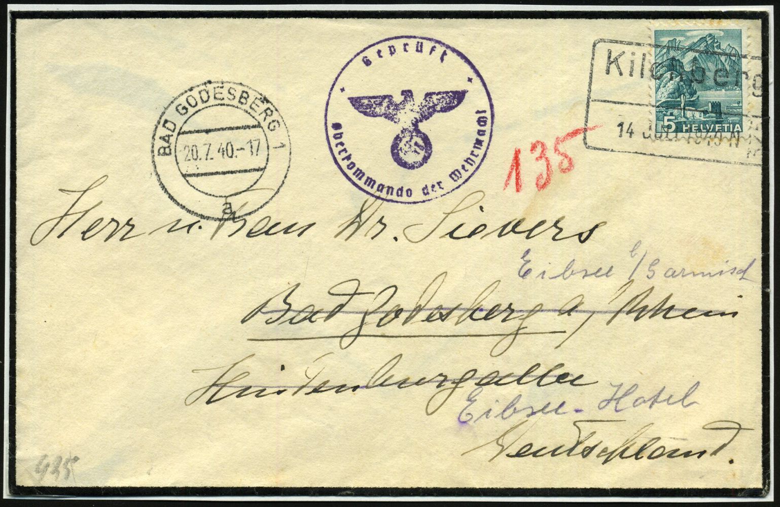 9990 | 25 € | 5320 BAD GODESBERG : BAD GODESBERG 1/ a 1940 (20.7.) 2K-Steg als AS + viol. OKW-Zensur-1K: Geprüft = Frankfurt/Main (Rie.E-2 a, + 50 Pkte.) Trauer-Zensur-Bf. aus der Schweiz (Bahnhofs-Ra.: Kilchberg) nachgesandt n. Eibsee (Mi.298) | ![]() | |