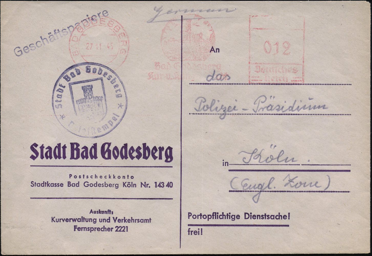 9992 | 28 € | 5320 BAD GODESBERG : BAD GODESBERG/ Kur- u. Kongreßstadt 1945 (27.11.) seltener, aptierter AFS Francotyp "Hakenkreuz" = entfernt = Notmaßnahme! (Abb.: Godesburg) zeitbedingt etw. schwach , motivgl. HdN: Stadt Bad Godesberg.., kommunal. Polizei-Dienst-Bf. n. Köln (Dü.E-12H-83Bo = seltene Type) | ![]() | |