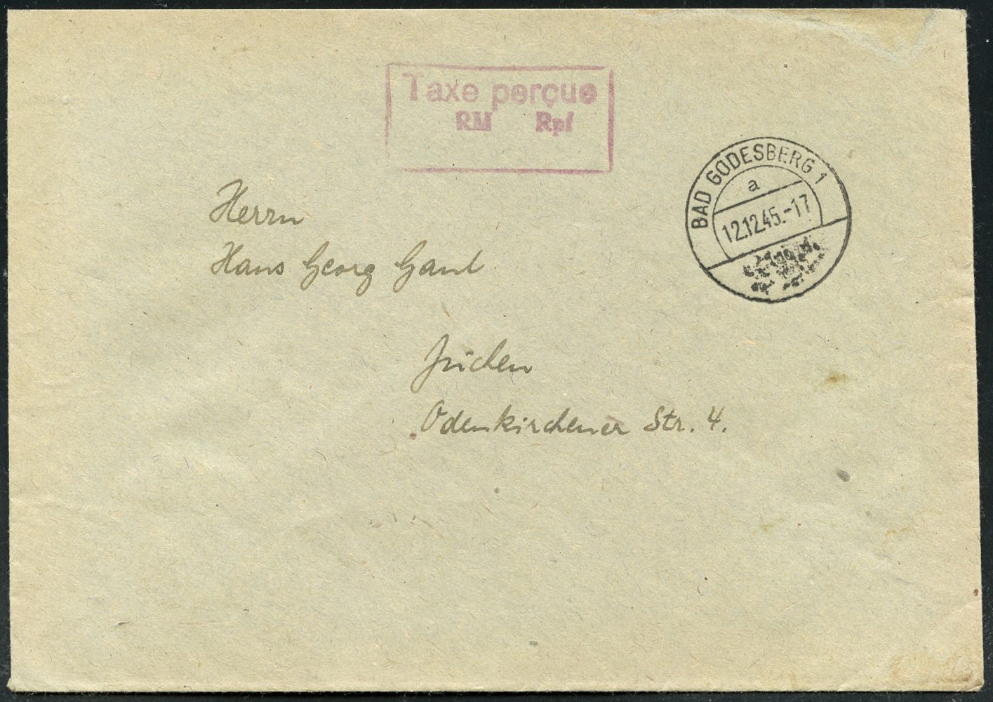 9993 | 18 € | 5320 BAD GODESBERG : BAD GODESBERG 1/ a 1945 (12.12.) aptierter 1K-Segment = "Nachträgl./entwertet" entfernt als Notstempel + viol. Ra.2: Taxe percue/RM Rpf, rs. Abs.-Vordruck: Aloisiuskolleg, klar gest. Inl.-Bf. | ![]() ![]() | |