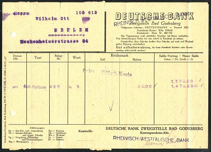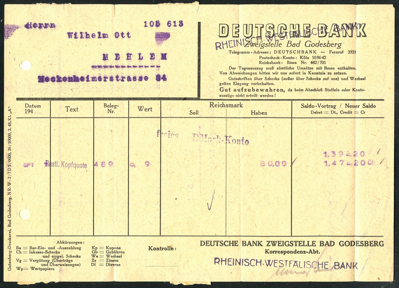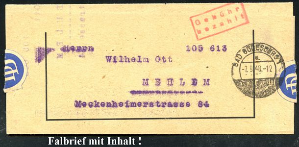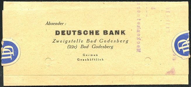 9994 | 18 € | 5320 BAD GODESBERG : BAD GODESBERG 1/ a 1948 (7.9.) aptierter 1K-Segm. = unten abgeschliffener Text von "Nachträglich/entwertet" = Notmaßnahme! + roter Ra.2: Gebühr/bezahlt, Firmen-Faltbf. mit Inhalt: Deutsche Bank, Kontoauszug (mit Papiersiegel) n. Mehlem | ![]() ![]() ![]() | |