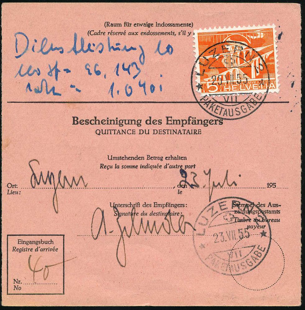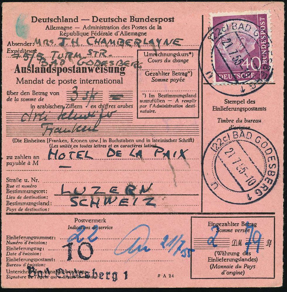 10002 | 25 € | 5320 BAD GODESBERG : (22c) BAD GODESBERG 1/ n 1955 (21.7.) 2-Steg aufEF 40 Pf. Heuss I + Paginier-2L: 10/ Bad Godesberg 1 , klar gest. rosa Ausl.-Postanweisung n. Luzern, rs. schweizer Zustell-Frankatur 5 C. (Mi.530) seltene Frankatur u. Kombination! (Mi.188 EF) | ![]() ![]() | |