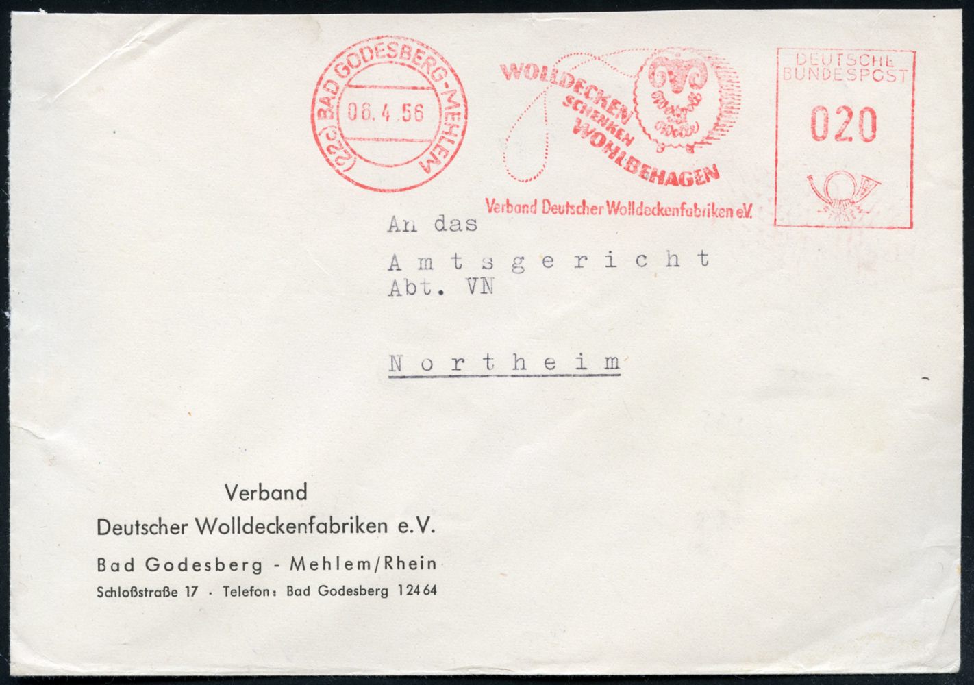 10003 | 15 € | 5320 BAD GODESBERG : (22c) BAD GODESBERG-MEHLEM/ ..Verband Deutscher Wolldeckenfabriken e.V. 1956 (6.4.) AFS Francotyp (Schaf, Woll-faden) Vordruck-Bf. (Dü.E-23CO) | ![]() | |