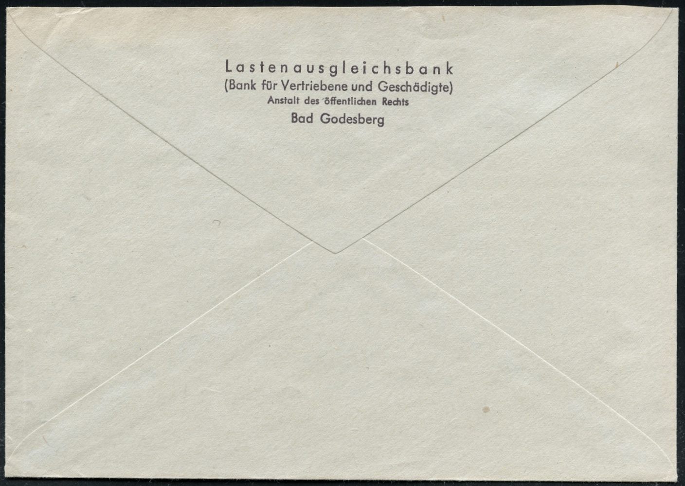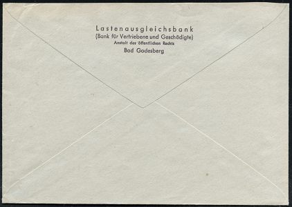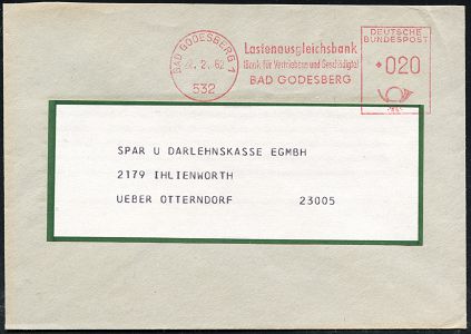10008 | 18 € | 5320 BAD GODESBERG : 532 BAD GODESBERG 1/ Lastenausgleichsbank/ Bank für Vertriebene u.Geschädigte.. 1962 (22.2.) AFS Francotyp mit Orts-1K mit kleiner, neuer PLZ = seltene Type , rs. Abs.-Vordruck, Fern-Bf. (Dü.E-23DO) | ![]() ![]() | |