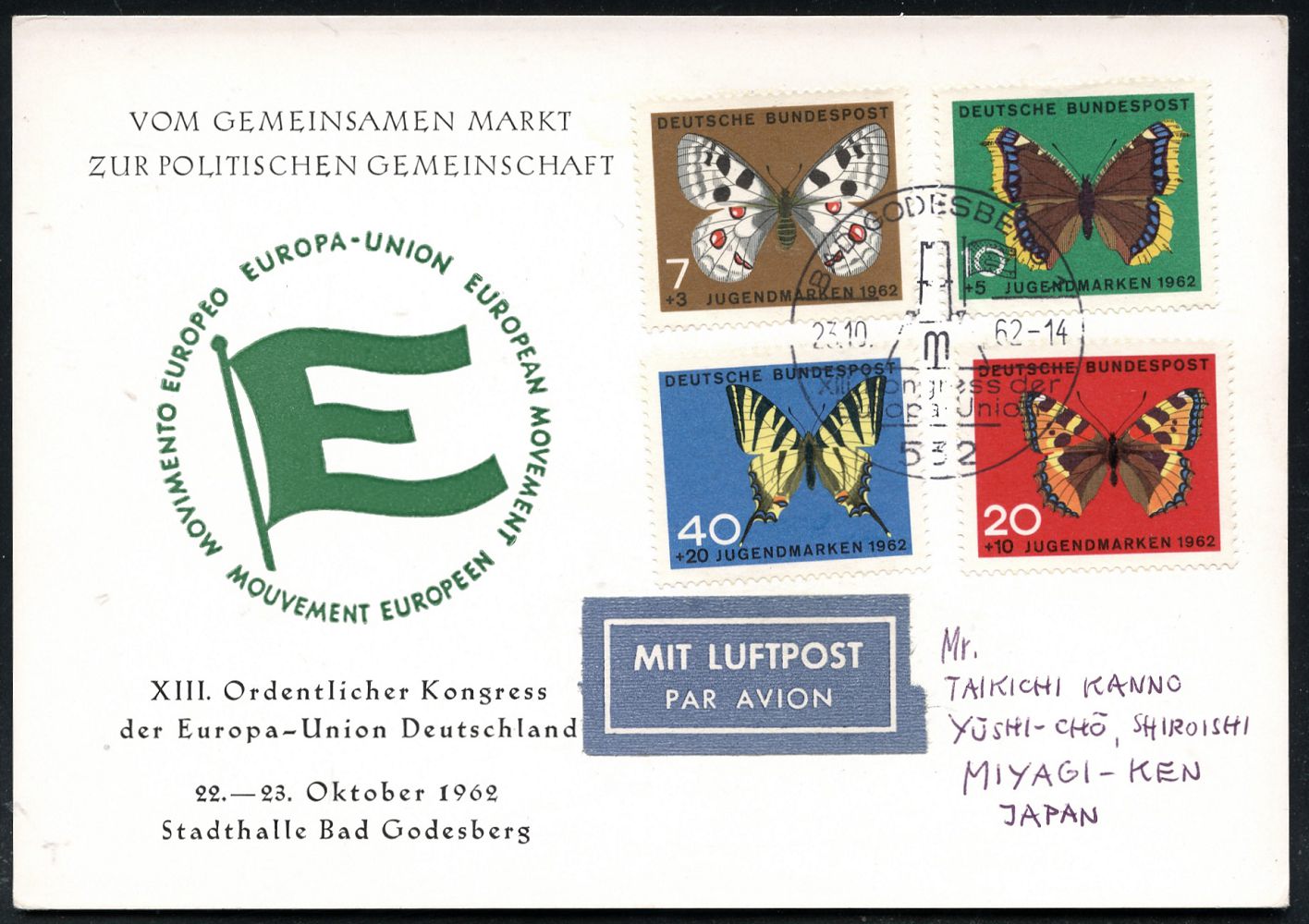 10009 | 18 € | 5320 BAD GODESBERG : 532 BAD GODESBERG/ Kongress der/ Europa-Union 1962 (23.10.) SSt (Godesburg) auf kompl. Satz Wofa "Schmetterlinge" (Mi.376/79 + 8.- EUR). Übersee-Flp.-Sonder-Kt.! (Bo.14) | ![]() | |